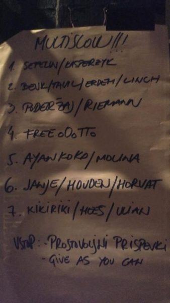 Vendar pa taka odprtost pri sami izvedbi hitro pokaže še svojo drugo, bolj zavezujočo plat. Množica glasbenih aktov – šest ali sedem na večer – ne utruja predvsem zaradi časovne usklajenosti, to pa marsikdaj pomeni tudi, da morajo nastopajoči svojo idejo na odru prezentirati v krajšem času – dolžine preteklih nastopov so se raztezale od deset minut do bolj običajne pol ure. Do sedaj so se v taki formi nekoliko bolje odrezale že obstoječe zasedbe, kakršna je na primer ljubljanska trojka oOo. Slednji se na robu punkerskega zvoka in improvizacijskega pristopa tudi po zaslugi preteklih glasbenih izkušenj (Rhythm Thieves, Crazed Farmers, Kombo) dobro znajdejo v različnih navezah. Tokrat jim je na sredinem nastopu družbo delal improvizator Ottó Horváth, ki je s svojo anarhično pozavno dobro pariral občasni bluesovski deviaciji raskavega vokala, umazani zvoki dveh kitar, ki ju je občasno nadomestil saksofon in vokal, pa so vezivno tkivo našli v bobnarski stalnici. Večkratne menjave ritma so sicer prispevala k občasnem občutku ‘komadov’, a ta zaradi občasnega ustvarjanja napetosti in šaljivih dialogov tudi ni prevladal.